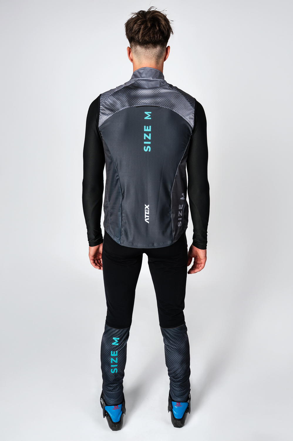 Bežecká vesta PROFI má polopriliehavý anatomicky tvarovaný strih. Na prednej strane je po celej dĺžke vodotesný zips s krytkami na oboch stranách a dve vrecká na zips. Prieramky sú lemované elastickým lemom, spodný okraj vesty je bez gumy a na bokoch sa nerozťahuje. Na prednej a zadnej strane sú výrazné reflexné prvky.