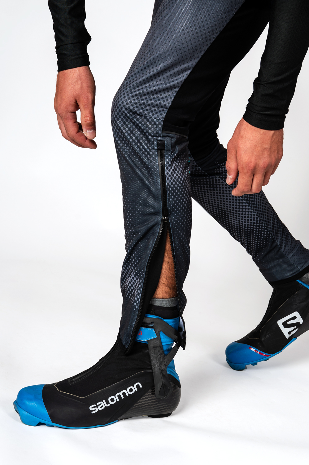 Dlhé nohavice na bežky PROFI majú polopriliehavý anatomicky tvarovaný strih. V páse majú elastický pás so sťahovacou šnúrkou a na prednej strane dve vrecká na zips so stopermi. Nohavice majú zipsy s vodoodolnou podšívkou až pod kolená, čo umožňuje jednoduché obliekanie cez obuv. Spodné okraje nohavíc sú zakončené lemovacou gumou. Na zadnej strane sú výrazné reflexné prvky.