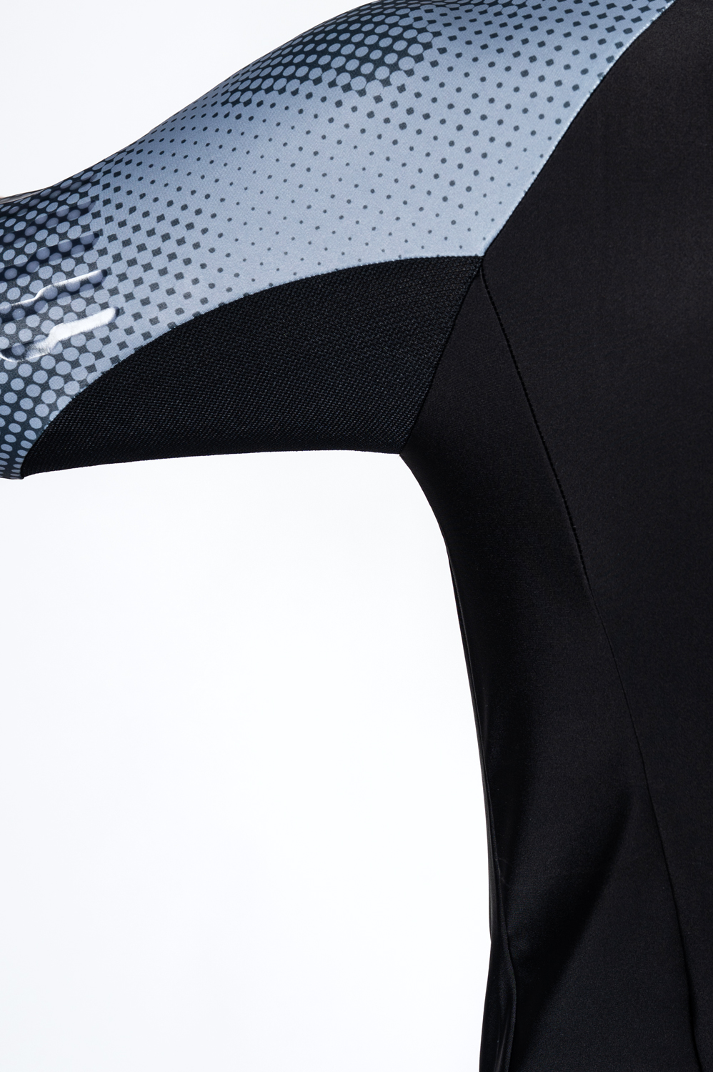 Vrchná časť dvojdielneho biatlonového obleku SPORT má priliehavý strih a je vyrobená z elastického materiálu ESPAN v kombinácii s ďalšími materiálmi použitými v detailoch. Na zvýšenie pohodlia je spodná časť stojacej časti podšitá zatepleným materiálom ROUBAIX. Materiál MESH, ktorý má sieťovinovú štruktúru pre lepšiu priedušnosť, je použitý na panely rukávov v zadnej časti podpazušia a na stredný panel rukávov na chrbte (neplatí pre detskú verziu).