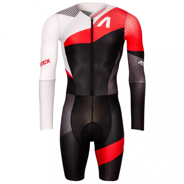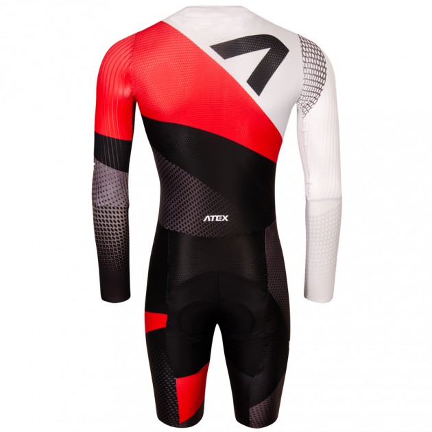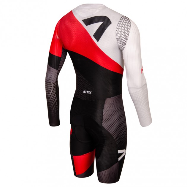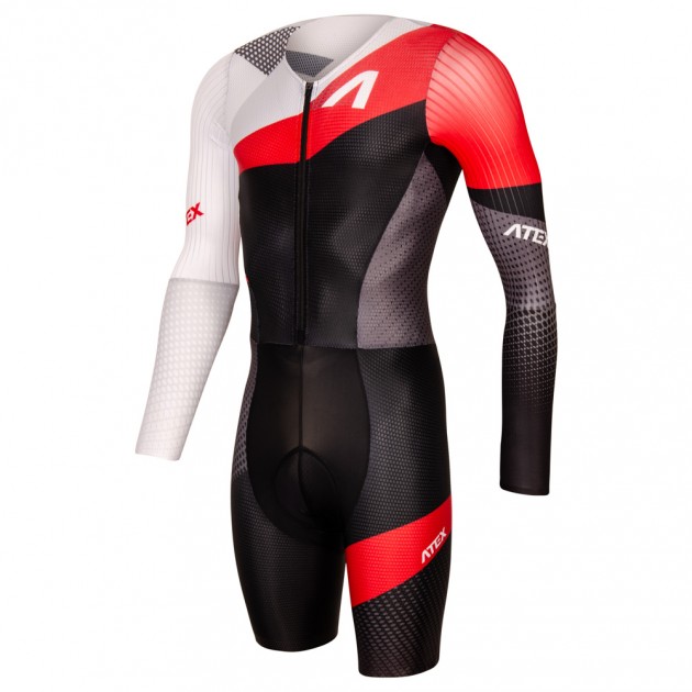 Cyklistický pretekársky oblek má priliehavý a výrazne anatomicky tvarovaný strih, ktorý zodpovedá typickej polohe cyklistu pri rýchlostných pretekoch. Vpredu je zips s jazdcom na doraz a výstrih je zakončený všitou gumičkou na pohodlné obopnutie krku. Kombinéza má vsadené dlhé rukávy a nohavice siahajúce nad kolená, oboje ukončené čisto strihanými okrajmi bez ďalšieho prešívania, s nalepeným silikónovým pásikom na zadnej strane pre stabilitu počas jazdy. Je vybavená podšívkou ELITE od renomovanej talianskej značky Elastic Interface, ktorá zaručuje vysoký komfort aj pri dlhodobej záťaži.