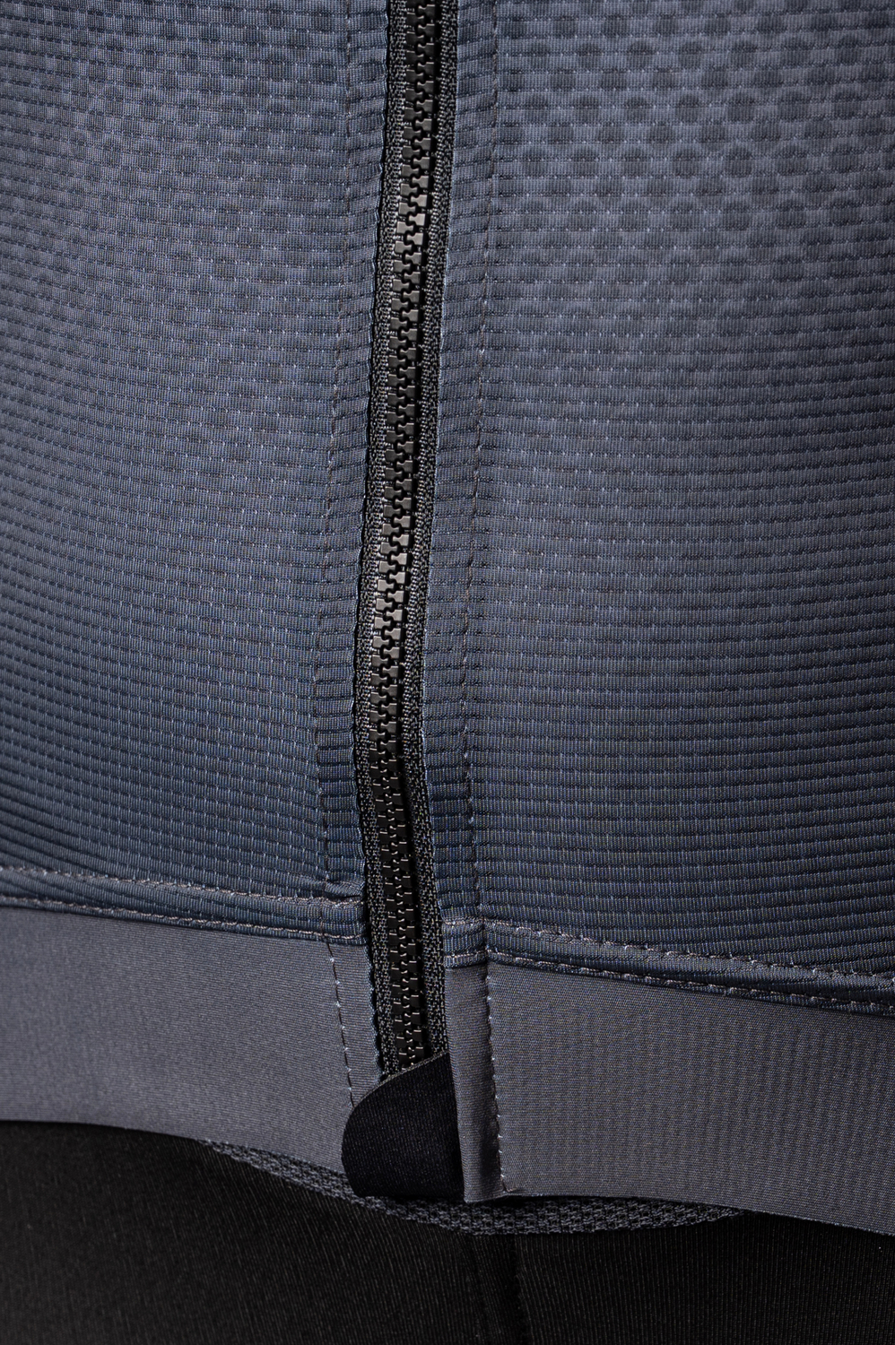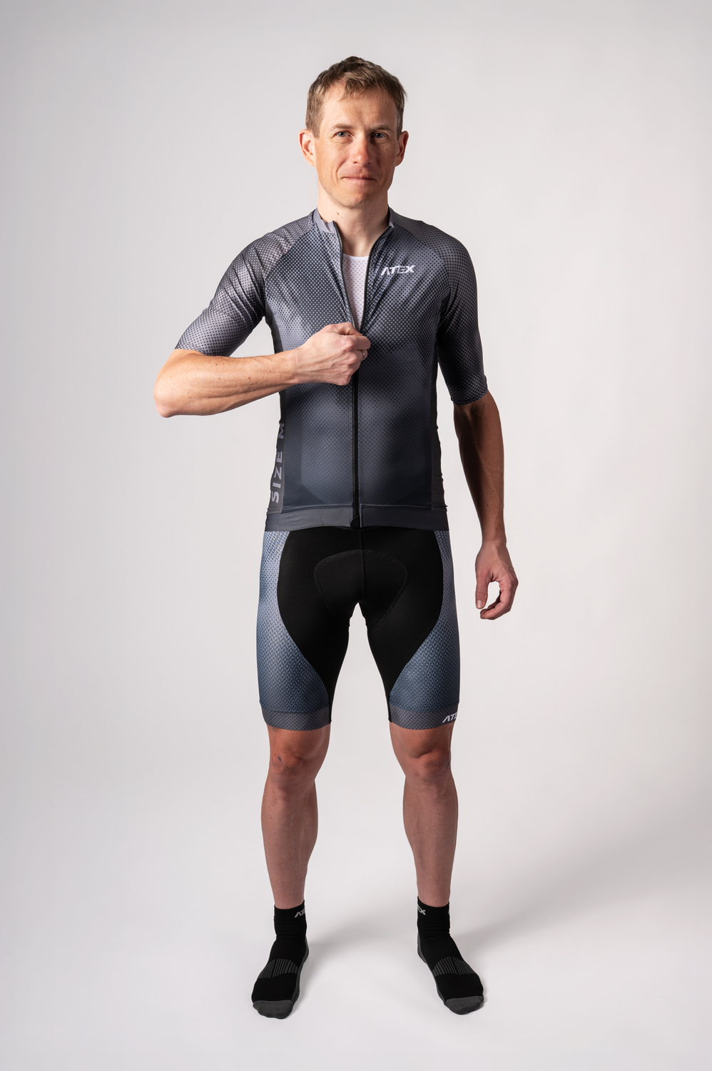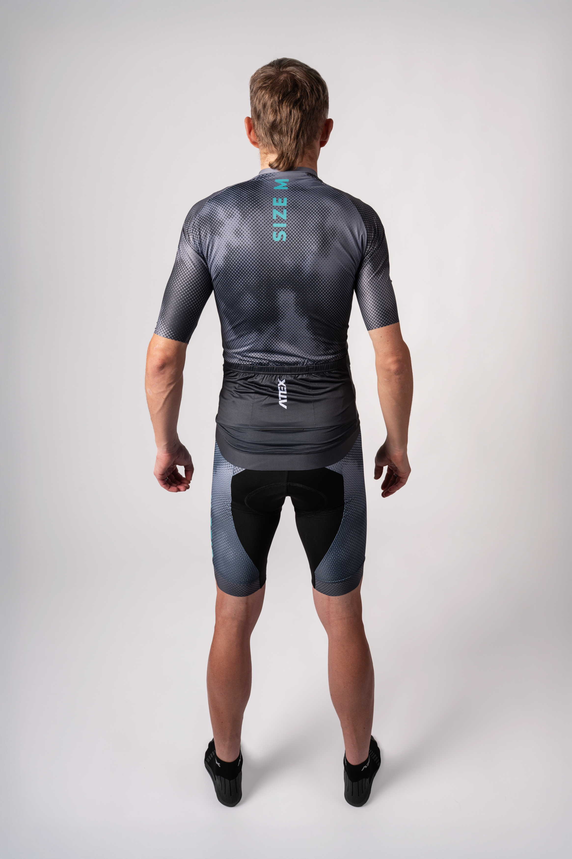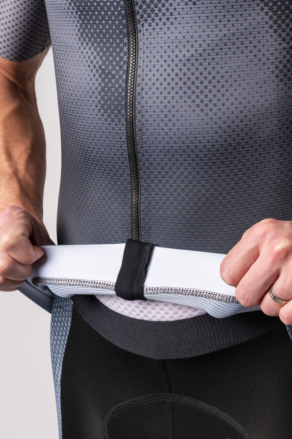 Dres má veľmi priliehavý strih, ktorý kopíruje telo a podporuje aerodynamiku. Na prednej strane je dlhý zips po celej dĺžke s jazdcom so zarážkou, ktorý zabezpečuje bezpečné zapínanie aj pri pohybe. Pri krku je nízky stojatý golier, ktorý neprekáža ani v pretekárskej polohe. Raglánové rukávy majú čistý strih bez dodatočných klinov, čo zaručuje maximálne pohodlie a hladké priliehanie k ramenu. Na zadnej strane sa nachádza trojdielne vrecko s reflexným prvkom na uloženie nevyhnutných vecí a zvýšenie bezpečnosti. Spodný okraj dresu je zakončený mäkkou 4 cm protišmykovou gumou, ktorá bezpečne drží dres na mieste.