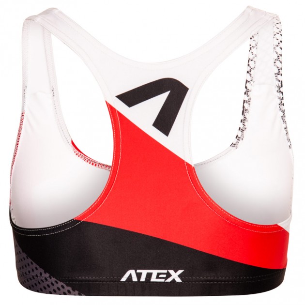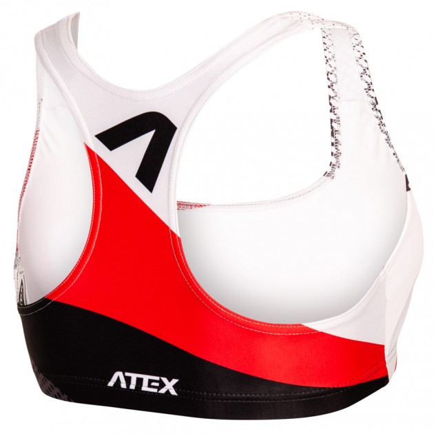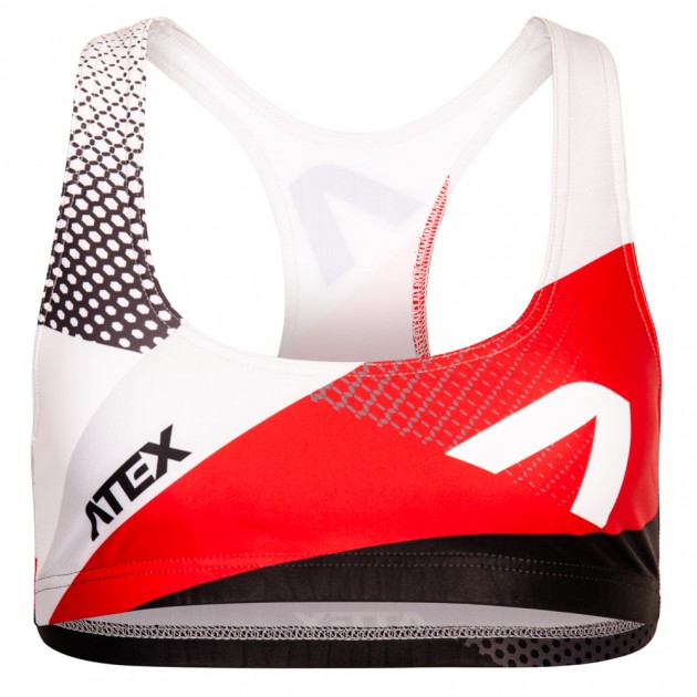 Predná časť je podšitá materiálom ASTERIA, čo zvyšuje pohodlie a funkčnosť. Výstrih a prieramky sú zakončené všitou gumou pre lepšie prispôsobenie. Spodný okraj vrchného dielu je zakončený 2 cm všitou gumou, ktorá zabezpečí, že vrchný diel zostane bezpečne na svojom mieste aj počas intenzívneho pohybu.