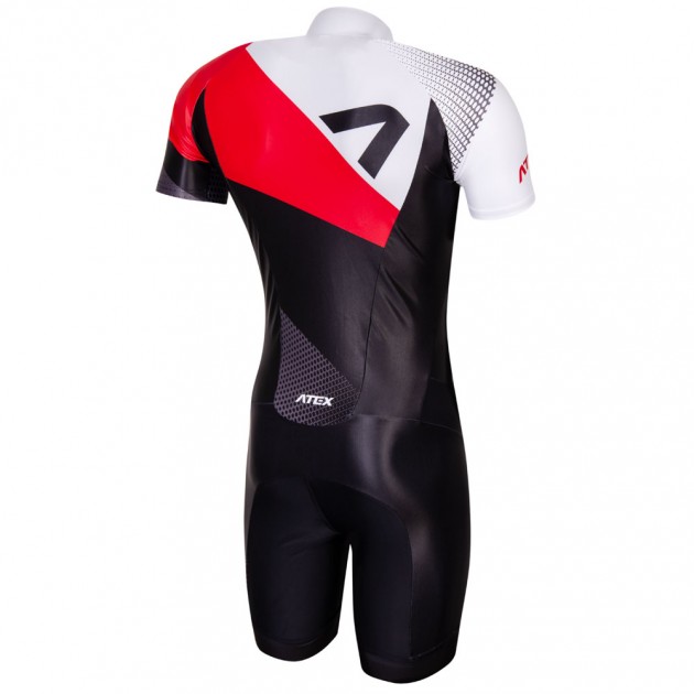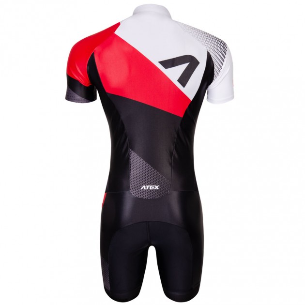 Kombinéza má predný zips s vrchným uzáverom, stojáčik pri krku je vzadu zvýšený, krátke raglánové rukávy sú vpredu špeciálne tvarované, nohavice v dĺžke do polovice stehien sú zakončené 4 cm širokou protišmykovou gumou.