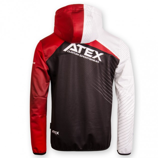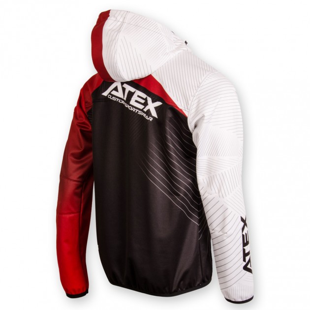 Športová bunda s kapucňou má polopriliehavý strih, celoprepínací predný zips s vrchným krytom, jedno náprsné a dve bočné vrecká na zips. Kapucňa má podšívku, sťahovaciu šnúrku a potlač na vnútornej strane. Bunda má vsadené rukávy s tvarovanými lakťami, rukávy sú zakončené elastickými manžetami. Dĺžka bundy je zahnutá.