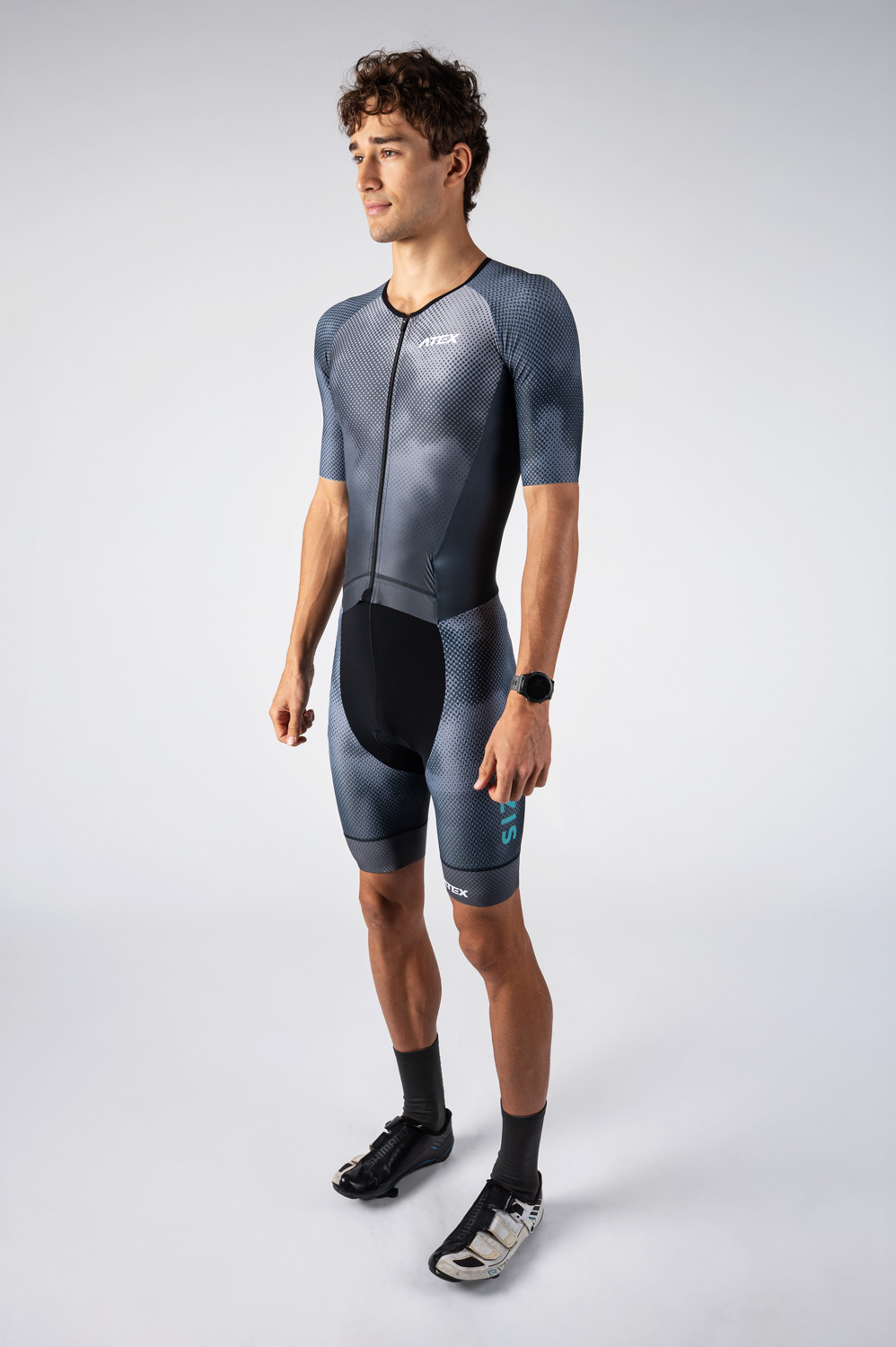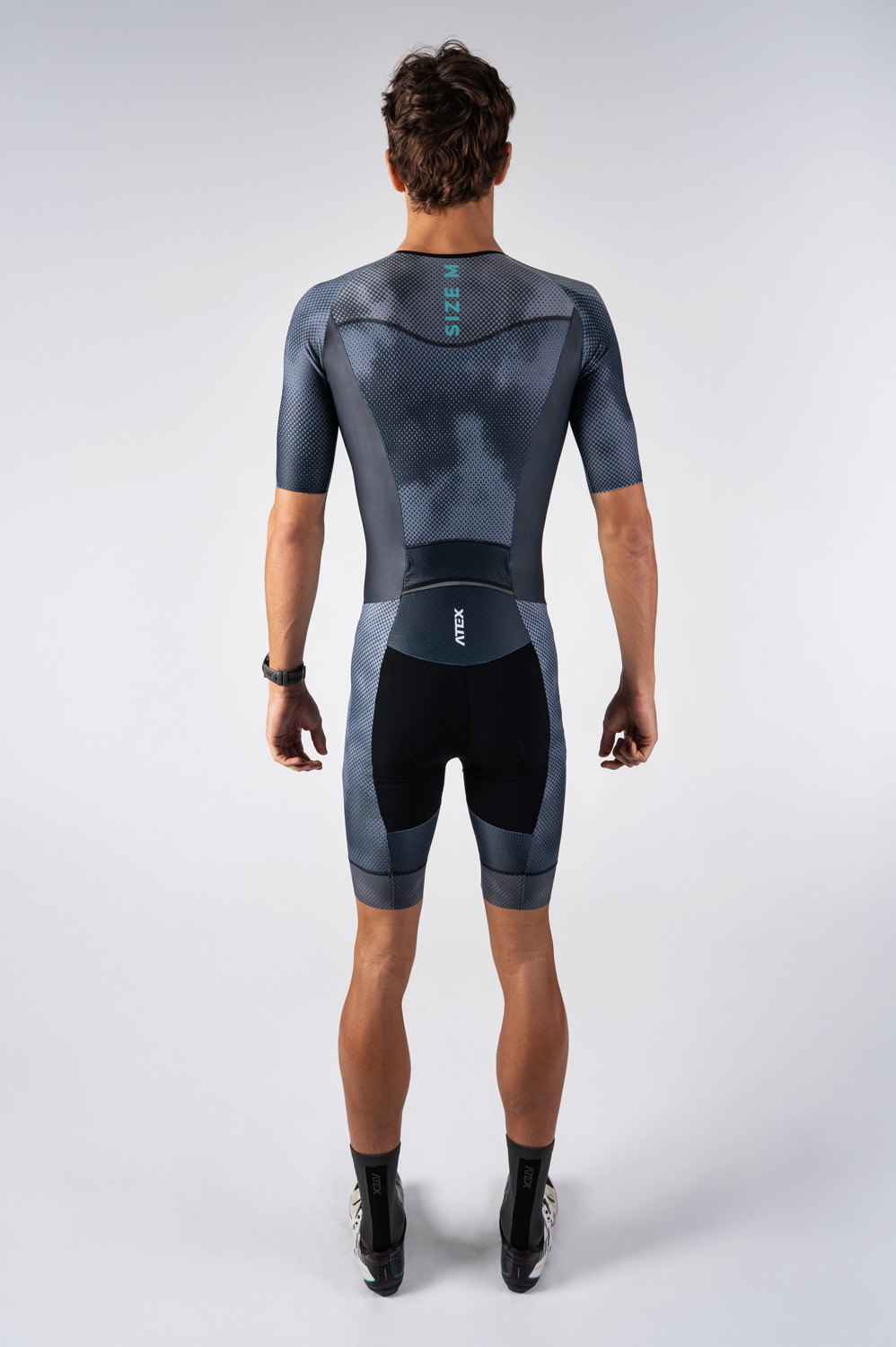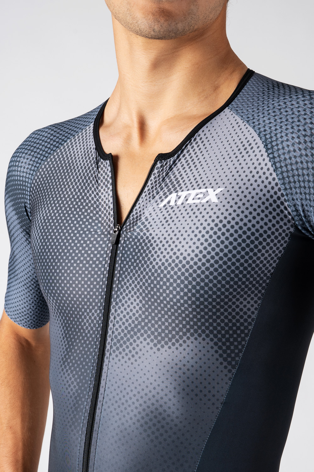 Triatlonový oblek ELITE s krátkymi rukávmi má priliehavý, anatomicky tvarovaný strih, ktorý podporuje aerodynamiku a voľnosť pohybu vo všetkých triatlonových disciplínach. Vrchný diel je vybavený celoprepínacím zipsom s jazdcom na doraz, ktorý umožňuje čiastočné alebo úplné rozopnutie zipsu a uľahčuje rýchle obliekanie. Výstrih s tenkým elastickým lemom je mierne v tvare písmena V, čo zvyšuje pohodlie v oblasti krku. Raglánové rukávy s dĺžkou po lakte sú ukončené čisto strihaným okrajom bez dodatočných zipsov, čo zabezpečuje hladké priliehanie k ramenu. Na zadnej strane je jednodielne objemnejšie vrecko s vrchným prekrytím na bezpečné uloženie drobných predmetov počas pretekov.
