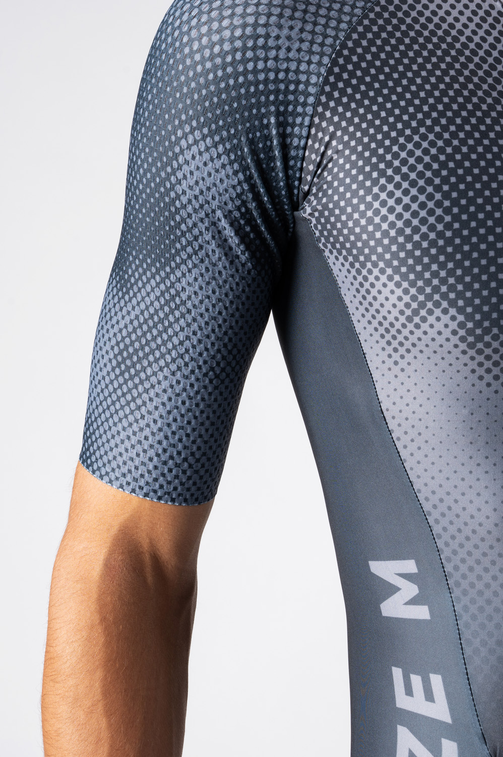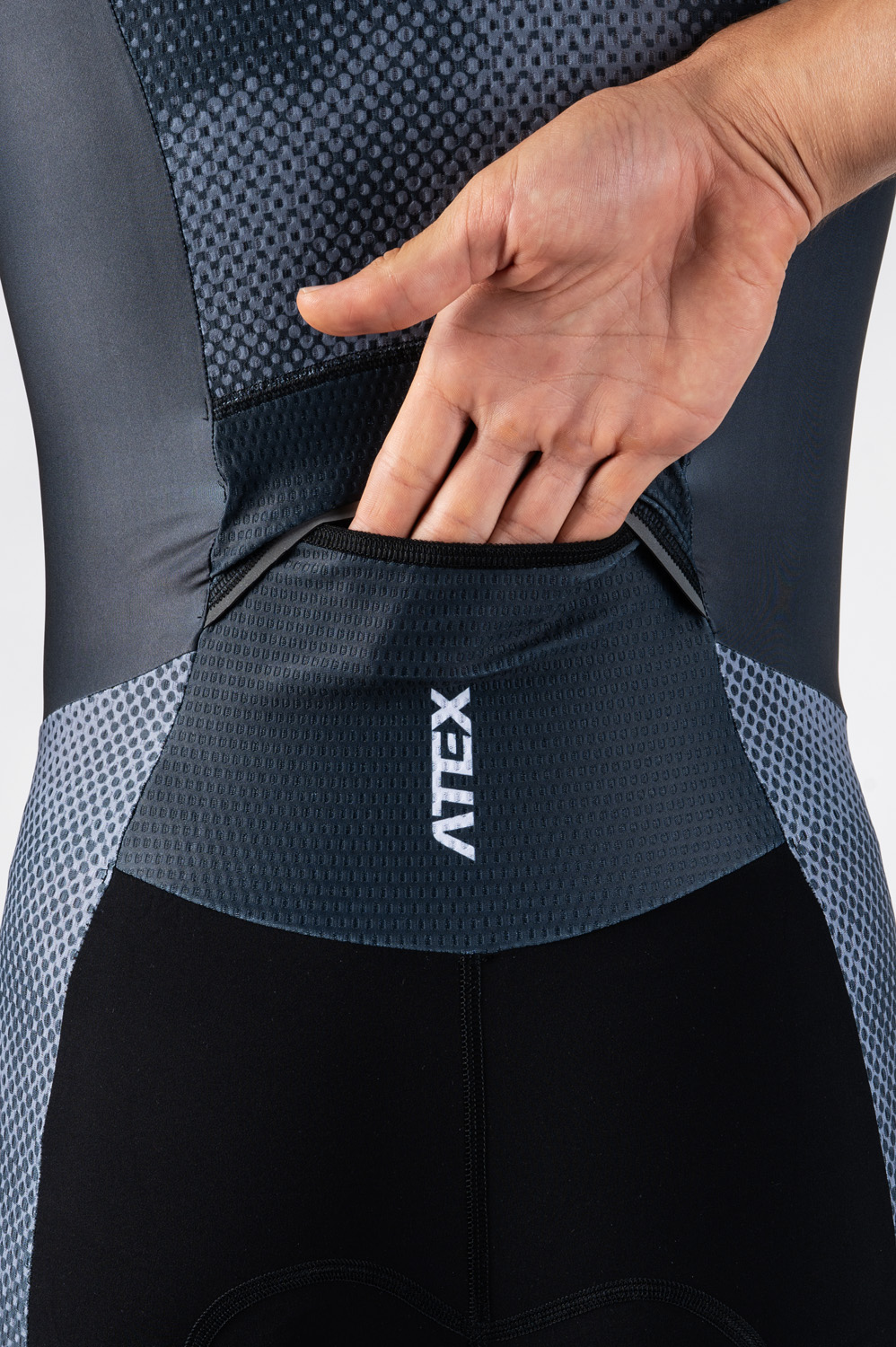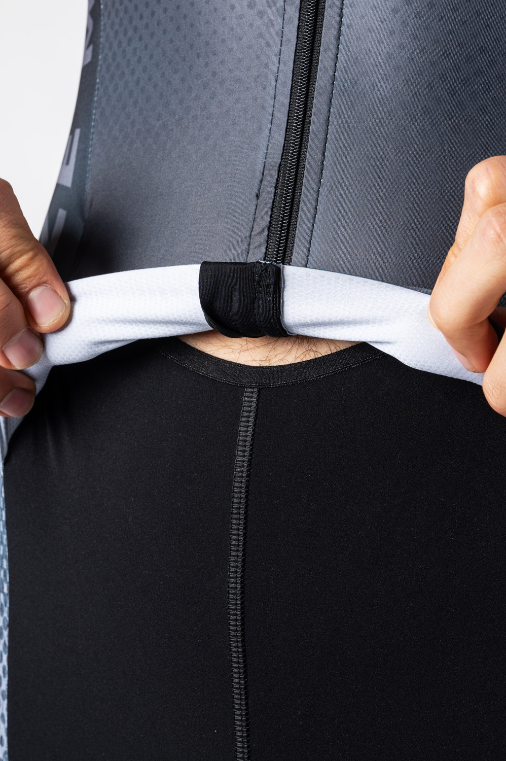 Triatlonový oblek ELITE s krátkymi rukávmi má priliehavý, anatomicky tvarovaný strih, ktorý podporuje aerodynamiku a voľnosť pohybu vo všetkých triatlonových disciplínach. Vrchný diel je vybavený celoprepínacím zipsom s jazdcom na doraz, ktorý umožňuje čiastočné alebo úplné rozopnutie zipsu a uľahčuje rýchle obliekanie. Výstrih s tenkým elastickým lemom je mierne v tvare písmena V, čo zvyšuje pohodlie v oblasti krku. Raglánové rukávy s dĺžkou po lakte sú ukončené čisto strihaným okrajom bez dodatočných zipsov, čo zabezpečuje hladké priliehanie k ramenu. Na zadnej strane je jednodielne objemnejšie vrecko s vrchným prekrytím na bezpečné uloženie drobných predmetov počas pretekov.