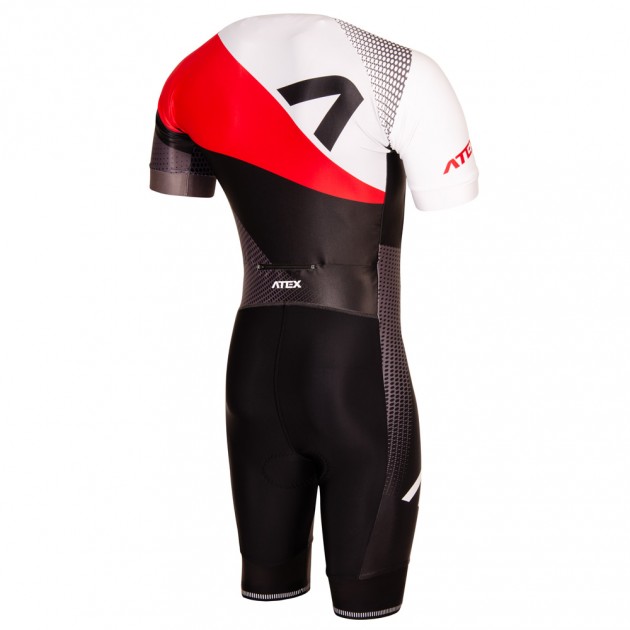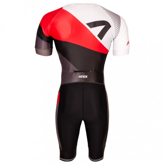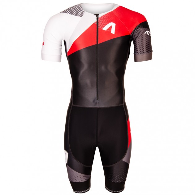 Pánska triatlonová kombinéza má priliehavý strih a je vyrobená z veľmi elastického materiálu Espan. Kombinéza má predný zips s vrchným krytom, okrúhly výstrih s našitou gumou, krátke raglánové rukávy ukončené 4 cm širokou mäkkou protišmykovou gumou, vrecko na zips na chrbte, nohavice v dĺžke po kolená ukončené 7 cm širokou mäkkou protišmykovou gumou s reflexným prvkom. Kombinéza obsahuje triatlonovú podšívku.