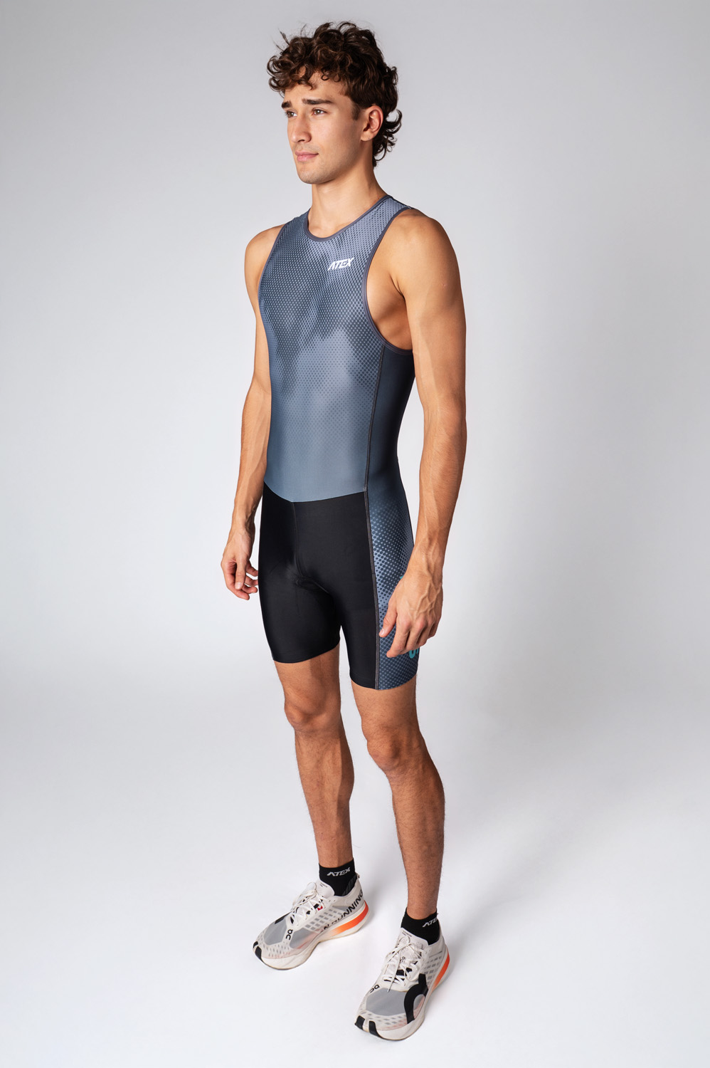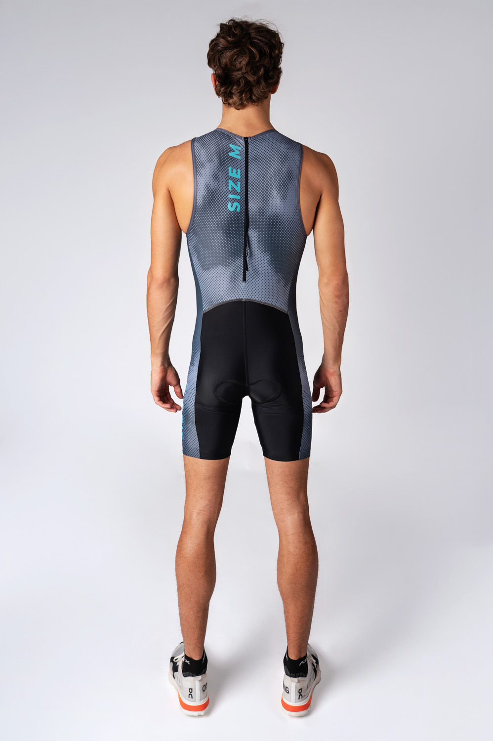 Triatlonová kombinéza bez rukávov má krátke nohavice zakončené protišmykovou gumou, ktorá pomáha udržať oblečenie pri pohybe na mieste. Na prednej strane je podšitý zips s prekrytím, ktoré chráni pred nepríjemným kontaktom so zipsom počas dlhšieho nosenia. Oblek je vybavený podšívkou TRIATLON od renomovanej talianskej značky Elastic Interface, ktorá je prispôsobená špecifickým potrebám multidisciplinárnych pretekov.